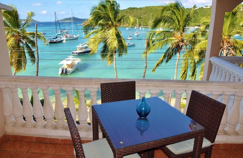 "Mojo Blue" is a beachfront luxury condo located at Grande Bay Resort. The unit boasts unobstructed oceanfront and bay views from the desirable second floor. Two balconies allow you to hear the gentle waves of Cruz Bay 30 feet from the condo. Part of the charm of Mojo Blue is having morning coffee or afternoon drinks on the balcony while watching the sailboats. The unit offers a lockout feature and may be rented as a 2BR, 1BR Master Suite or 1BR Studio Suite. Each option has a private entrance to accommodate families or couples. Both sides have a washer/dryer and are fully air conditioned.