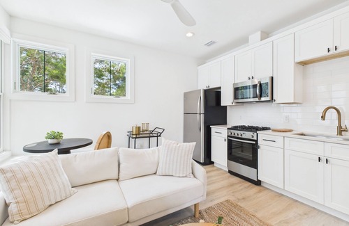 Charming carriage house with private beach access! This thoughtfully designed 1BR/1BA unit features a queen bed, full kitchen with gas stove, Smart TV, and high-speed WiFi. Relax in the cozy outdoor lounge or hit one of two community pools. Just minutes from gated beach access and local 30A attractions. Perfect for a couple’s getaway or solo retreat!