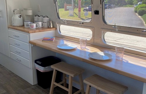The kitchenette is well equipped with a retro fridge, microwave/convection oven, two burner cooktop, Keurig, and electric tea kettle. Complimentary coffee and tea are provided for your enjoyment. The airstream is equipped with a premium water filter.