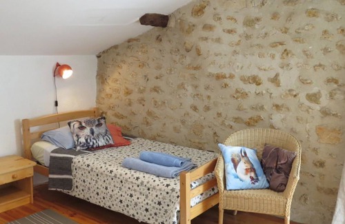 Lovingly restored farmhouse part of small complex of 5 gîtes provides great family accommodation. Martrieux has 4 bedrooms, 3 bathrooms and a lovely secret garden with barbeque. 10 acres of gardens, woods, meadows to explore in the Perigord Vert National Park. The sleepy hamlet of Nadaillac nestles in a river valley between La Rochebeaucourt (5km)and Villebois (8km) close to Angouleme and Perigueux. A stunning rural position with walks straight from the door yet all amenities close by.