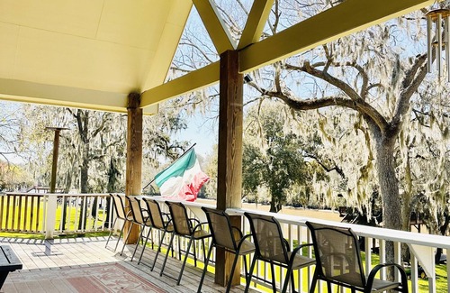 Escape to the shores of the San Bernard River for an unforgettable escape with loved ones! Just an hour's drive from Houston, yet secluded, this 7-bedroom retreat promises relaxation and adventure. Whether you're unwinding on the deck, casting lines off the pier, or sharing stories around the fire pit, every moment here is infused with the promise of adventure. The main level, situated on the second floor, features the kitchen, living/game rooms, laundry room, master suite. Upstairs, two bedrooms with queen beds, a full bathroom and a loft with a queen pullout couch await. On the first floor, discover three more queen bedrooms, a bunk room with two bunk beds, and another full bathroom. Step out onto the expansive balcony from the living room to overlook the backyard and river, or head down to the private boathouse and deck for waterfront relaxation. Parking is a breeze with space for three cars in the driveway and additional street parking available. 521 Public Boat Ramp 16 mins away!