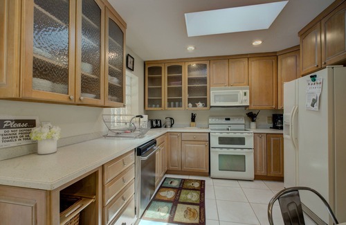 Kitchen: New appliances (fridge with ice/water, range, dishwasher, microwave), fully equipped for 8.