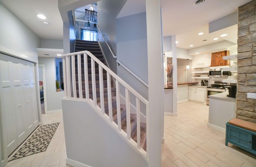The kitchen is stunning with a handmade wooden countertop (bar seating) and open shelves to easily view and access everything you need to cook. Amenities include stainless steel appliances, coffee bar and an open concept so you can socialize with the cook. The dining room table can sit 10 people.