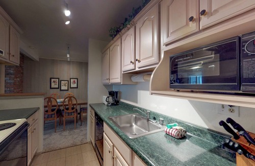 The condo grounds are meticulously landscaped, with lush green grass in the summer and snow-covered trees in the winter. Three outdoor hot tubs are available, as well as a large outdoor pool that's heated on chillier days. The athletically inclined can practice their games on two tennis courts and two pickleball courts, and kids will love playing on the jungle gym. A beautiful shared outdoor area has a large fireplace for guest use, so be sure to pick up some steaks and beer while you're out and about.