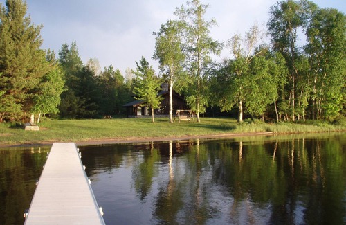 Cozy, 1100 square foot, cedar log cabin with 150 feet frontage on 600 acre inland lake. Beautiful, northern lake view out of large front room picture windows. Quiet and private setting with all the comforts of home. Sand beach with 85 foot dock, and 14 foot aluminum boat are included. A canoe & Kayak are available for $35 for the week. Recently renovated bathroom includes a large ceramic tiled shower, new pine board walls, custom vanity and ceramic floor.
