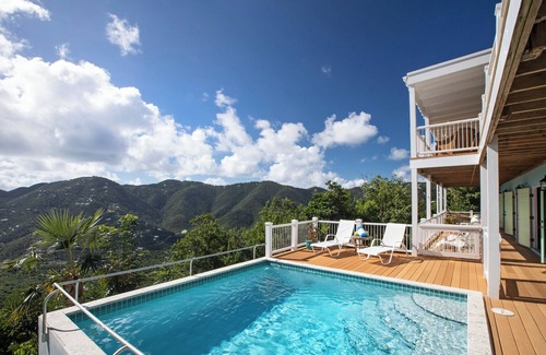 Everything about Great Turtle invites you to relax. Spend the day in the cushy rockers on the deck or let your cares slip away as you lounge by the pool. The Caribbean-style decor offers a comfortable mix of inviting antiques and pleasant elegance. The villa's lush tropical gardens are filled with birds-of-paradise, scarlet bougainvillea and rainbow-colored hibiscus. Slice a papaya for breakfast or pick your own lime for cocktails. But it's the awe-inspiring view - sparkling white sails bobbing on turquoise water in Coral Bay, shimmering islands on the horizon, the ever-changing greens on the verdant hills of Bordeaux Mountain, the speckled browns of sugar mill ruins peeking through the foliage of Carolina Valley - that you will carry forever in the memory of your visit to St. John and Great Turtle Villa!