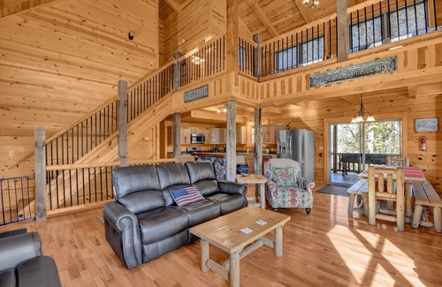 The main level of Green Acres Lodge is wheelchair-friendly. You'll love the cathedral ceiling in the gorgeous great room, which features a stone fireplace, live wood columns, and chef's kitchen complete with granite counter tops, stainless steel appliances, and island with a stone and live edge wood bar. Take some time to relax on the wrap-around covered porch on the main level, complete with outdoor wood-burning stone fireplace, comfortable patio furniture, and a private covered hot tub. You might also enjoy the view from the sleeping loft, an upstairs bedroom balcony, or from the downstairs pool table room or bedroom with access to the lower level deck. The lower level also includes a 60-game arcade cocktail table and Smart TVs with WiFi for streaming for your enjoyment, or sit around the fire ring and tell stories of the day or days gone by.