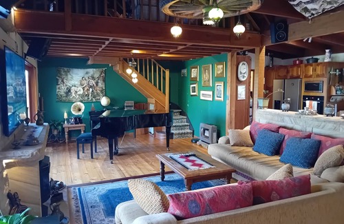Central living area with a sandstone fireplace, baby grand piano and large lounge. 55" TV with Netflix / UTube Internet / WiFi and sound system.