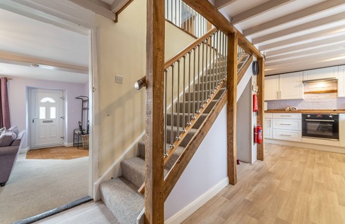 Once upon a time this delightful cottage was the village pub, The Greyhound. It still has a cellar and a snug to remind you of its former past, but otherwise you really wouldn't know. Decorated in soft pastel colours, comfortably furnished in a contemporary style, with modern filament lightbulbs lighting some of the rooms, the cottage has an easy, relaxing feel throughout. On entering the front door you are welcomed by a spacious sitting room with a wood burning stove. To one side of the sitting room is an equally roomy dining room; perfect for friends and family to enjoy a meal together. On the other side, a few steps up from the sitting room, a cosy snug provides another wood burning stove, desk and the L-shaped sofa is the place to be if you want to quietly read, need to work or study. The modern fitted country-style kitchen is very well-equipped with everything you need if you like to cook and want to sample some of the wonderful produce found locally. For those who prefer to eat out, and don't wish to drive, you can pop over the road and enjoy a meal at the bistro restaurant, The Aviator. When it's time to retire for the day, upstairs you will find three bedrooms (a stunning split level master super-king suite, a second super-king bedroom with twin option, and a bunk room) along with two bathrooms, one of which is en-suite to the master bedroom. Outside, you have a choice of seating areas; a picket fenced courtyard garden immediately outside the kitchen, and an enclosed landscaped gravel, bark and flower meadow area with lovely views to the rear of the courtyard barn.