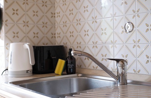 A fully equipped kitchen with oven, microwave, kettle, toaster, and a charming green dining table, with matching chairs also on the terrace