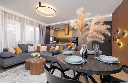 This exclusive 67.68 m² apartment will comfortably accommodate 6 people. . Apartment is the ideal place to stay for those who value comfort, aesthetics and an excellent location. The layout of the rooms includes a living room with a kitchenette, two elegant bedrooms, a balcony and a modern bathroom. The entire apartment is furnished with high-quality materials, which creates a stylish and cosy interior. The living room stands out with large windows that let in plenty of natural light, as well as a comfortable sofa with sleeping function, a TV and a designer dining table. The living room leads out onto the balcony, which offers views of the apartment building's surroundings and is the perfect place to enjoy your morning coffee outdoors. The kitchenette is fully equipped with modern appliances such as a fridge, dishwasher, oven, microwave and coffee machine, while additional gold and wood details add a luxurious touch. The bedrooms are decorated in muted colours, with comfortable queen-size beds, roomy wardrobes and decorative accents. With blackout curtains, they provide the perfect environment for relaxation. In addition, one of the bedrooms has a desk that will provide a comfortable place to work or study in front of the computer. The bathroom is spacious and equipped with a bathtub with shower function, modern fixtures and fittings, a washer/dryer and a hairdryer. Evening entertainment is provided by multimedia, such as a flat-screen Smart TV and cable TV, as well as Wi-Fi access. Guests are provided with complimentary toiletries, towels and bed linen for a good start. In addition, an underground parking space has been provided for those travelling by car.
