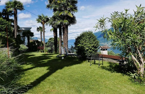 In the roofs of the historic Brissago Porta in Ticino and surrounded by palm trees, the wonderful garden with private piazza, sun deck and large panoramic lawn of Casa Caterina extends. In the middle of the garden is the detached holiday home Casa Fiore. The view of the mountains and Lake Maggiore is breathtaking. Summer or autumn holidays for 2-4 people, 2 separate bedrooms, two toilets, a separate kitchen, large garden and a private piazza.