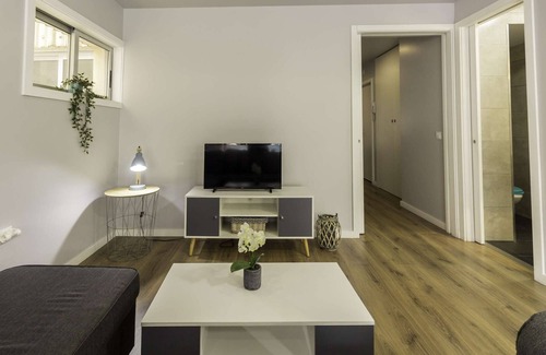 The living room includes a comfortable sofa that converts into a sofa bed, allowing the flat to accommodate up to seven guests. The TV has direct access to Netflix for your entertainment.