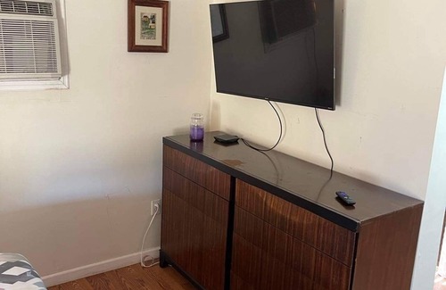 Studio apartment with full kitchen, bathroom with shower only and sitting area. Large open floor plan. Side by side fridge. Covered parking, Queen sized bed, love seat and chair in living room area and bar top dining.