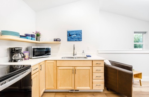 The suite shares its property with a main house, but it has a separate and private entrance. Ascend a flight of interior stairs to find a bright living space with large windows and high ceilings. There's a kitchen with stainless steel appliances, a table where you can sit down for breakfast or reply to emails in the afternoons, and a leather sofa where you can curl up to stream your Netflix favorites. You'll also have a washer/dryer in the hallway, one bedroom, and one full bathroom.