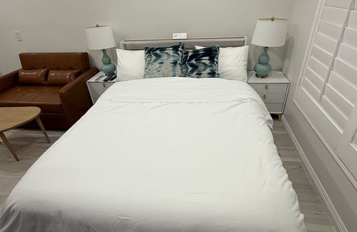Welcome to your cozy retreat with a private entrance. This suite features a small kitchen and closet room with ample luggage space, a microwave, refrigerator, and coffee maker for quick meals and coffee. The bathroom has a shower, and the bedroom includes a queen-size bed, couch, study table, chair, and a 65” TV with WiFi. Equipped with heating and air conditioning, the suite ensures comfort. Although part of the main residence, it offers complete privacy.