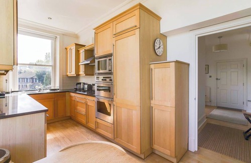 Welcome to our home! This lovely, high ceiling, converted period property with view of Centre Court is located on the 1st floor with stair access. The spacious and bright living room feature a sofa and TV - a wonderful place to relax, flooded with light from the tall windows and overlooking Wimbledon Village. The kitchen is equipped with everything you need to prepare a lovely home cooked meal, including an oven, stove and microwave, along with basic kitchenware, a coffee machine and dishwasher!