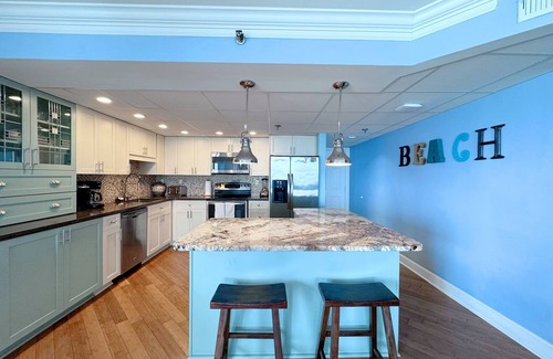 This large Gulf-front condo (Over 1,400 sq ft) boast attractive hardware floors, cottage decor furniture, two bedrooms, sleeps six, and is located at the beautiful WATERCREST CONDOMINIUMS on Thomas Drive. The condominium has many amenities including FREE WIRELESS INTERNET, 50 inch Flat Screen TV with HBO, DVD, Flat Screen's in both bedrooms, fully-equipped kitchen, huge private balcony overlooking the Gulf of Mexico, king-size bed in the master, and two Queen-size beds in the second bedroom. NEW KITCHEN! With Granite/Quartz Counter-tops & Breakfast Bar! Comes with covered parking for one vehicle!