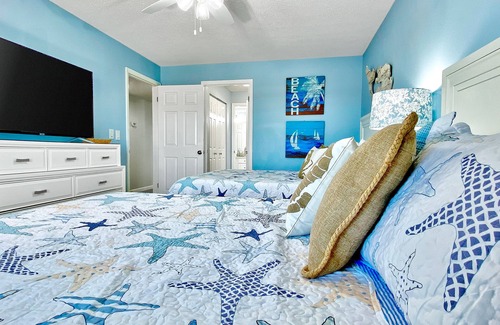 Step inside to find a light-filled living area with an unbeatable beachfront backdrop, a well-equipped kitchen with stainless steel appliances, and an adjacent dining area for eight. There are smart TVs in the living room and bedrooms, free WiFi and cable service, as well as beach towels and a washer/dryer provided.