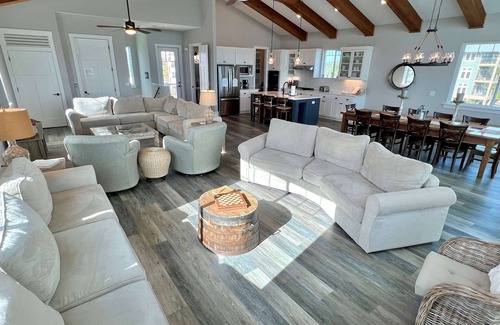 The great room is just that - a show-stopper! The entire top floor is an open-concept kitchen-living-dining space with vaulted ceilings and an amazing ocean view from the countless windows and huge 12'x35' foot deck! From the deck, you can enjoy watching the sunrise each morning with a cup of coffee, and then watch the glorious sunset each evening. The living area has room to spare and is ready for your whole group to watch a movie or the big game on a huge screen TV, play games, or enjoy long overdue conversation time. The fully appointed kitchen is perfect whether you are looking for easy meals or full-on gourmet cooking! And the huge farm table lets everyone enjoy a meal together! A walk in pantry offers plenty of space to hold all your provisions right where you need them, but out of sight. To complete this floor, there is a 1/2 bath and a covered porch overlooking your private pool!
