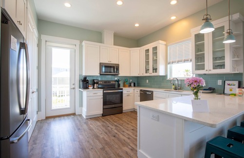 *The back deck provides a venue for relaxing and taking in the gulf view. The dining table seats 8. The kitchen is loaded with prep and serving amenities, dishwasher, microwave, refrigerator, range and plenty of quartz counter space. The home includes an HDTV in the living room and all bedrooms. Cable programming and wifi are included.