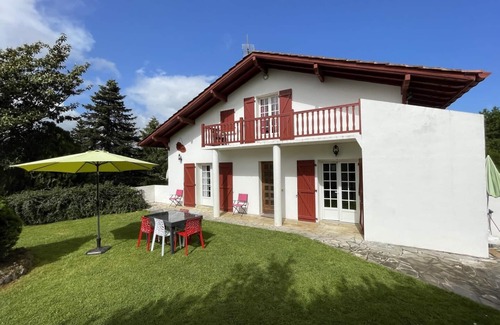 Pleasant, bright and functional detached house, isolated in the quiet countryside of the Basque hinterland. Ground floor: Equipped kitchen. Living room/lounge with fireplace. 2 bedrooms (2 double beds). Shower room/wc. WC. 1st level. 1 bedroom (1 double bed. 1 single bed. 1 cot)/balcony and outdoor exit to the garden (stairs). Private bathroom and wc in this bedroom. 2 car garage. Heating gas and wood in supplement. Large enclosed garden 2300 m2. Orchard, vegetable garden and small chicken coop available. Garden Lounge. Barbecue. East exposure. Possibility to rent sheets.