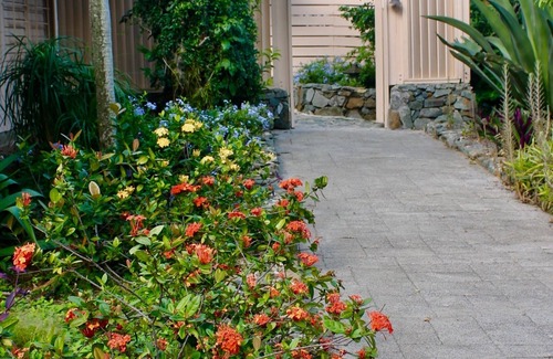 Get close to St. John’s abundant natural beauty with this secluded and affordable island home. Just a few minutes’ drive from Cruz Bay, HAIKU is the first architect-designed, traditional Caribbean-style house built on the island. Designed in native West Indian style influenced by the Danish great-houses, Haiku is built on one floor at ground level; it is safe for children and is wheelchair accessible. Entry is through a garden gate beyond which is a covered, open-air living/dining room pavilion made from hand-laid stone. Island trade winds keep you cool while lounging in the living room, eating at the dining room table, or just enjoying the peace and quiet of the adjoining tiled patio. A garden of native flowers and trees provide shade and quiet not just for you, but for island birds and animals as well. While cooling off in the patio swimming pool (about 19' x 9' x max. 4.5' depth), you might spot one of the resident iguanas feeding on the garden flowers.