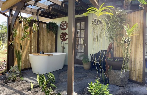 E Komo Mai (welcome) to Hale Hapu’u! Our little Hawaiian hut is perfect for couples seeking an authentic Big Island experience. The Hale is adorned with hand carved art from local artists, an outdoor bath set in the midst of a tropical garden of ferns, palms & orchids, and a lanai/dining room overlooking lava features & new landscaping. Modern amenities of AC, Internet and Roku will make your vacation more enjoyable. And close proximity to Volcano NP and the ocean.