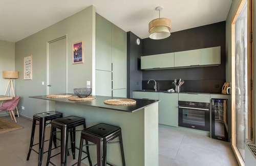 Welcome to this accommodation, composed of a bright living room with a sofa bed facing the television for your moments of relaxation, as well as a dining area with a large table and its design chairs. The fully equipped kitchen is open to the living room, as well as a bar and its high chairs. There are two separate bedrooms with double beds, each with a television for your comfort. The bathroom is modern and functional with a bathtub. The balcony has a breathtaking view of Lyon and is furnished with garden furniture, a table and high chairs!
