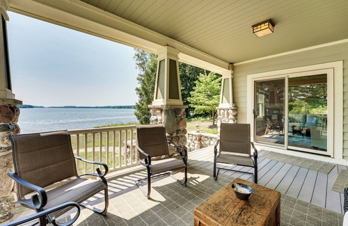 Ready for an Up North reset? This 6-bed, 6-bath vacation rental near Ludington offers a tranquil lakefront setting, where afternoons on the water lead into family-style dinners on the deck and evenings by the fire. The separate garage apartment offers added privacy, so everyone can stay close without feeling crowded. From sunrise paddles to stargazing nights, each moment feels effortless at this charming home.