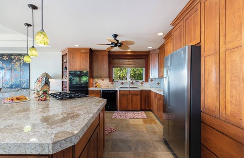 The main home is a five-bedroom paradise, beautifully decorated with one-of-a-kind artwork created by the owner. Lush landscapes, ocean scenes, and tastefully done Kauai photos will keep you busy for hours as you wander room by room to see the next piece of art. For maximum comfort, this home provides two king beds, a queen, and two full-size beds. Three bedrooms downstairs with the kitchen, living room, and dining area opening to the ocean. Two master suites upstairs offer tranquil views with their very own en-suite bathrooms. Across the little garden retreat filled with fragrant lemon trees, you will find the tastefully decorated two-bedroom guest quarters. Complete with a queen-sized bed in each bedroom of the two bedrooms, relax comfortably and enjoy the epicurean kitchen and fine finish work.