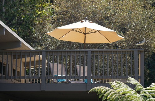 Our house is limited to 4 registered guests and rented very sparingly, and our single story "Hawaiian style" 1950's beach cottage is located on a private dead end street with a level, flat yard.... just 300 yards from the beach. Private and sunny backyard patio and sundeck with views up to tree filled open space hillside, total quiet and zen! Please read our reviews. You'll have sun, solitude, total privacy, a large backyard, sundeck, and sublime quiet in this classic/vintage, mid-century beach house, which is located on this very quiet cul de sac backing up to a Santa Cruz County Designated Scenic Corridor greenbelt in your back yard. From the backyard watch the wild-birds, seagulls, red- tailed hawks, and then listen to the owls at night. (did we say NO stairs ?!!...ours is a single story house, large level front yard and level fenced backyard, and short level walk to the sand).