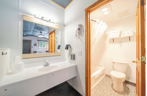 Cabin Description: This private, ground-floor cabin offers a serene and secluded stay, with no neighbors above, below, or beside you. Featuring a comfortable king bed, the cabin accommodates up to 2 people. Recently updated, the cabin has fresh paint, new flooring, modern bed frames, and a high-quality mattress, along with upgraded AC/heat units. Additional upgrades include blackout shades, a new table and chairs, and refreshed bathroom fixtures. Enjoy the convenience of 50" 4k Smart TV providing access to your favorite streaming networks, cable TV, a mini-fridge, microwave, and coffee maker. The private bathroom features a shower/tub combination, hair dryer, and complimentary toiletries. A private outdoor bench is available just outside the cabin, perfect for enjoying the peaceful surroundings. Please note: This cabin is smoke-free and pet-free.