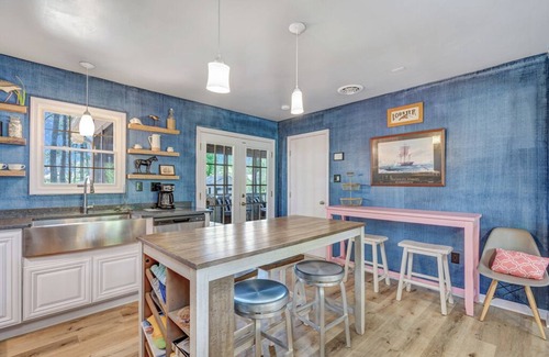 Now let us tell you a little about ‘Happy Hideaway’, and we will lead with, you’ll never want to leave this adorable Chincoteague Cottage. As you pull down Oak Drive, Happy Hideaway, adorned in red, boldly welcomes you to Piney Island. Surrounded by whispering Oaks, just imagine sitting on the Porch feeling that sea breeze while listening to the Tree Frogs sing. Upon entering, you will find Happy Hideaway to be every bit as captivating with bold blues, distressed wood, and a fabulous beach decor.