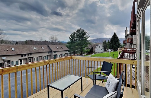 The main living area on the first floor greets you with plush sofas, a Smart TV, and a gas fireplace, creating a warm and inviting space for lounging. Step out onto the furnished balcony to soak in the peaceful views, or gather for meals in the separate dining area just off the fully-equipped kitchen.