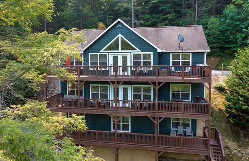 The main level kitchen is enhanced with granite counter tops and custom Tennessee built cabinets. The majority of the main level has authentic hardwood flooring, 17 foot tall cathedral ceilings, a 50” LCD TV, two dining areas, a beautiful owners suite equipped with a king bed and a desk for catching up on work activities. The owner’s bath is top of the line with a Jacuzzi type tub and tile flooring. The 2nd bedroom on the main level has a king bed and adjoins a full bath via a private entrance. This 2nd bath is also open to the great room and is a common bath. The 3rd bedroom offers two full beds and a great view. The Main level deck extends the length/width of the home as do the other 2 levels of deck, and offers a sunning area with lounge chairs at one end and a table and chair area, with a large stainless steel grill, at the other.