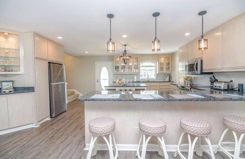 The kitchen has been recently updated with new granite countertops and stainless steel appliances, while keeping with the comforts of home. Each morning, enjoy the sunrise with a hot mug of coffee directly from the Keurig coffee maker or a fresh smoothie using the Ninja blender. Meals are an easy set up with a breakfast bar able to seat five and an adjoining dining space, capable of seating a comfortable 8.