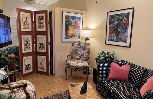 This intimate suite is in the center of town, with Waterfront view facing the harbor. It has King bed and attached bath with walk-in shower and granite vanity. Recently redecorated with seating area, custom screen and Large Screen TV which may be viewed from bedroom or living area. High ceilings, Cork floors.