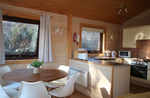 The living area is light and airy with a vaulted ceiling and sliding doors to a decked terrace. There is smart open plan fitted kitchen with hob and oven with extractor hood a fridge/freezer and dishwasher. Should you have a rainy day you can relax in front of the TV on the comfortable squashy sofas and enjoy Sky or a DVD, or have fun playing a board game. The lodge is cosy and warm and perfect for a winter break as well as for summer holidays. Please note there is currently no Wi-fi due to the rural location and limited mobile phone reception.