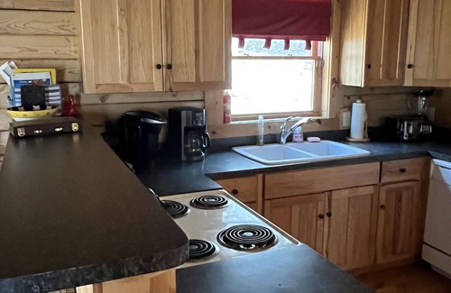 Linens, paper products, and firewood are provided. The kitchen has the basics for cooking and eating.