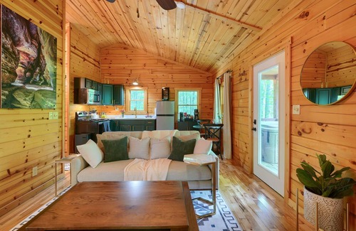 The cabin offers a warm and welcoming interior featuring rustic log walls, polished hardwood floors, and a delightful décor that blends modern amenities with a classic cabin ambiance. It includes a spacious bedroom with a king-sized bed, premium mattress, and bamboo luxury linens, complemented by French doors that lead to the living area. The living space is cozy, furnished with comfortable seating, a stone fireplace, and a flat-screen TV paired with an Infinity game table—ideal for a relaxing and romantic evening. The kitchen is fully equipped with contemporary appliances, cookware, a wine fridge, and both drip and Keurig coffee makers.