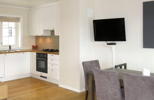 "Havsdalsgrenda", 5-room apartment 125 m2 on 3 levels. Tasteful furnishings: 1 room with 1 double bed (160 cm, length 200 cm), shower/WC. 1 room with 1 x 1 bunk beds (80 cm, length 200 cm), 1 double bed (150 cm, length 200 cm). Sauna. Upper floor: living/dining room with dining table, satellite TV and gas heater. Open kitchen (oven, dishwasher, 4 gas rings, toaster, kettle, freezer, electric coffee machine). 2nd upper floor: 2 rooms with sloping ceilings, each room with 1 double bed (160 cm, length 200 cm). Shower/WC. Electric heating, underfloor heating. Parquet floors. Box-room. Panoramic view. Facilities: children's high chair, baby cot (extra). Internet (WiFi, free). Please note: non-smoking house. Smoke alarm, fire extinguisher. Freezer approx. 50 l. 924531169
