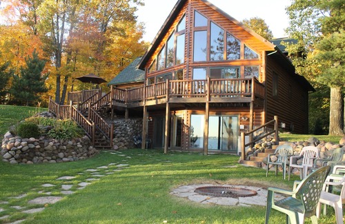 EXTERIOR OF HOME: Enjoy the sunset while sitting around the huge fire pit overlooking the lake (plenty of lawn chairs provided and a limited amount of complimentary firewood is included). Take the winding steps down medium elevation to the lake and the private 'L' dock with 100' of private frontage. Seasonal neighbors on both sides are friendly and have large oversize lots with plenty of mature trees, so there is plenty of privacy. The driveway is fully paved and is large enough for 4 trucks and trailers, or about 8 cars. The whole family will enjoy the level paved Basketball court, while they watch the children play in the sandbox. The landscaping is well maintained with an automatic sprinkler system. A complimentary lift for your pontoon, boat, or PWC is available at no extra charge; inquire with owner. Lac Courte Oreilles is a large lake and can have 3 foot waves during storms; so this is an important amenity since it makes the difference between having to take your boat out, or having major damage to your boat or dock. NEW We now have an automatic back-up generator! Although rare, being in the northwoods with lots of trees it seems like there is at least one storm a year that will blow a tree on a power line, or a winter ice storm that breaks a power line. In the event there is a power outage you may not even know it since the generator will automatically restore power so you will have water, refrigerator, lights, microwave, furnace, TV, etc. Keep in mind all these comforts won't work if the power goes out... We know how important your vacation is and have taken the extra step/investment to make sure you are comfortable and worry free no matter what the weather!