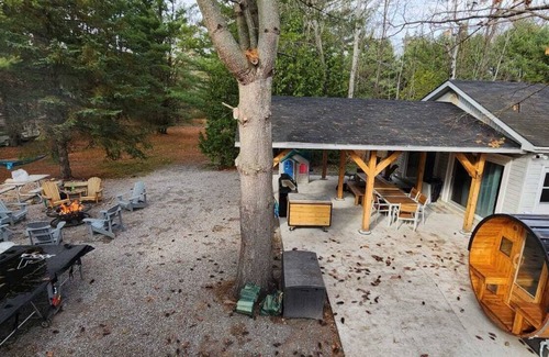 1.5HRS From Toronto, waterfront access to 2 lakes from dock (Head lake and Rush Lake) . Fully renovated, central heat and ac, lots of parking, fishing off dock, large grassy 3 acre lot with trees surrounding property for privacy, LOTS OF ACTIVITIES, Barrel Sauna, hottub, volleyball, billards and more.