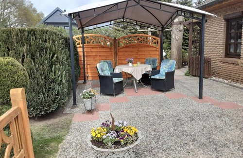 The house half of 65 square meters on the ground floor is designed for up to 5 people/ 4 adults + toddler/ and is in a quiet idyllic location. Equipment: Two bedrooms with double beds (adjustable slatted rusting), 1 cot/ living room with a new upholstered set, satellite TV, WiFi, reading selection. The kitchen offers space for five people, children's high chair, fitted kitchen with refrigerator, ice cream cupboard, electric stove, microwave, dishwasher, kettle, egg cooker, coffee machine, caffissimo, toaster, mixer, radio with CD and dishes for 12 people. Bathroom with toilet and shower.