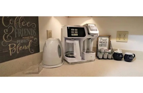 ~Ground coffee and #4 filters if you like drip coffee (we offer you a Hamilton Beach FlexBrew that can make a 12 cup pot of coffee or single serve K-cup brewing)
