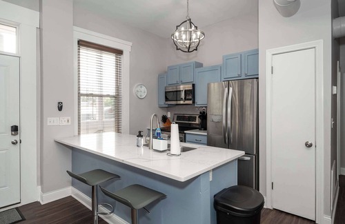 Inside the home, the open concept living area is furnished and decorated in modern greys and a signature shade of blue. A large sectional couch defines the living area which also has a large smart tv, coffee table, and accent chair. Adjacent is the modern kitchen with stainless steel appliances, spacious countertops, and eye-catching blue cabinetry. 2 barstools are arranged at the kitchen counter for casual dining, and for more formal meals, the dining table with seating for 2 awaits.
