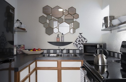 The casita has a small patio with two sets of glass doors--one each opening into the living/dining area and bedroom. Bedroom has double curtains, so you can make your sleeping space as sunny or as cozy as you like. Kitchen is fully equipped for cooking, and outfitted with a full-size refrigerator and freezer, four-burner cooktop and oven, cookware, cutlery, French press, kettle, and the like.