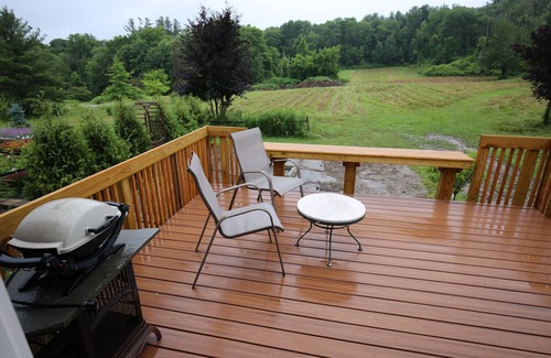Newly renovated, one level house with 2 rooms with king sized beds, 1 queen size sleeper sofa. Fully furnished kitchen, new bathroom with tub/shower. Washer, dryer, electric fireplace, deck, and hot tub. Fire pit, horseshoes, walking trails, use of field, and access to adjacent garden center full of colorful shrubs and perennials.