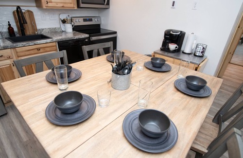 Cozy up with a movie in our queen bedroom at the end of the night or enjoy the electric fireplace in the living room. Need additional sleeping space? The living room converts into a versatile second sleeping area with one couch featuring a pull-out queen bed and the other expanding into a bunk bed! The kitchen table also expands for additional seating up to 6 with the included bar stools.
